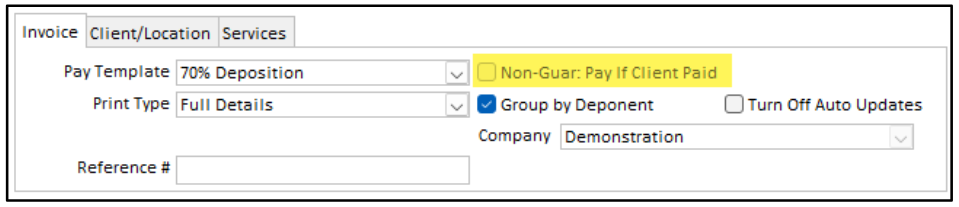 The Non-Guar: Pay if Client Paid checkbox is at the top of the window. It only applies IF a non-guaranteed pay type is selected on the invoice.