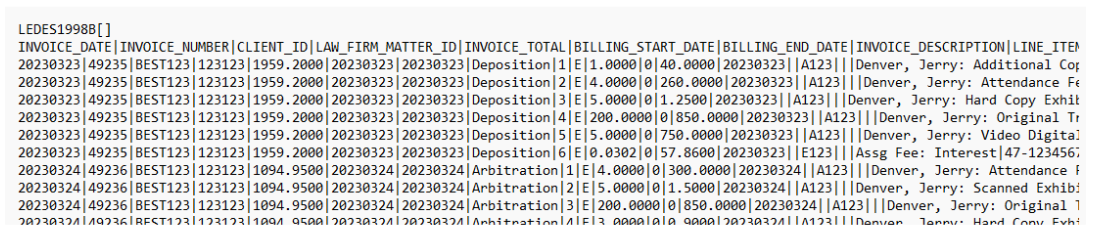 The LEDES 98B file is a text file that has fields delimited with the | character and a line for each item of an invoice.
