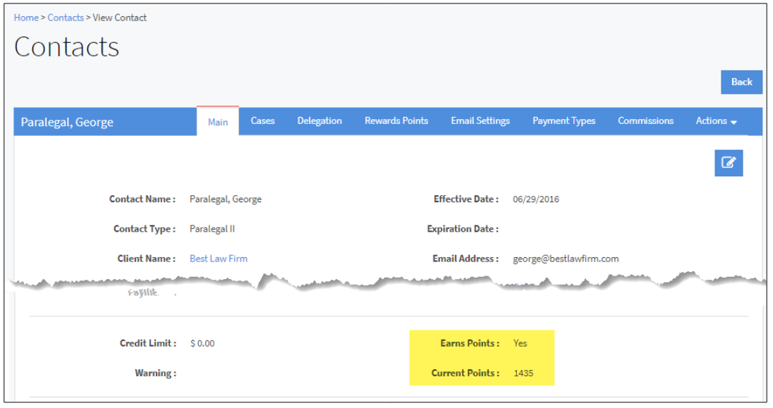When a company user is viewing a client or contact, they will see if they earn points on the client and contact details pages. (These can only be edited in Solaria.)