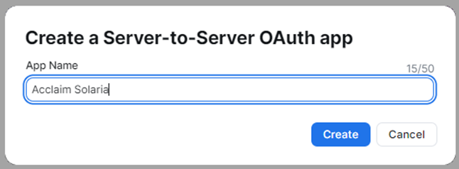3. It will prompt you for a name to give the application. Enter a name such as “Acclaim Solaria” then click on Create.