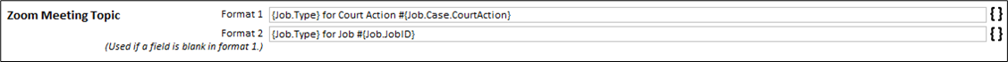 Enter the text and fields you want to use for the Zoom meeting topic in Format 1. If you choose a field that may not be populated on all jobs, you can enter alternate text to use in Format 2. Solaria will use that if a field in Format 1 is found empty. Limited field codes are available for the meeting topic.