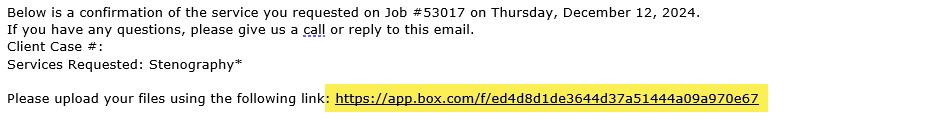 When an email is sent that includes this link, it will display the link for users to click on to get to the website where they can upload files for the job.